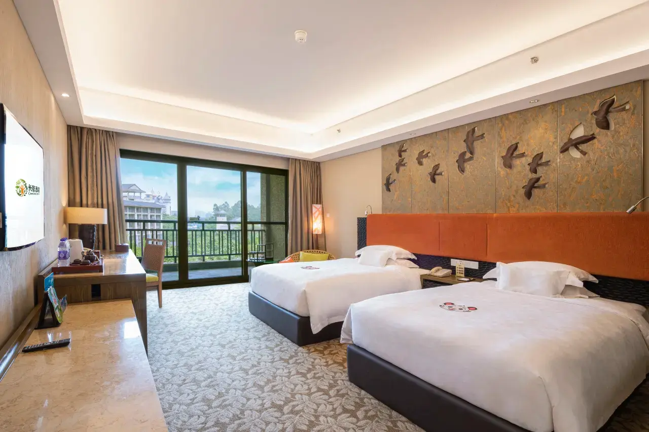 Discover the perfect blend of adventure and comfort in the Safari Room – Two Beds at Chimelong Hotel (Guangzhou Chimelong Safari Park). This spacious 55㎡ room is thoughtfully designed for families or groups, featuring two single beds (1.3m wide) and a private balcony that opens up to a tranquil garden view.